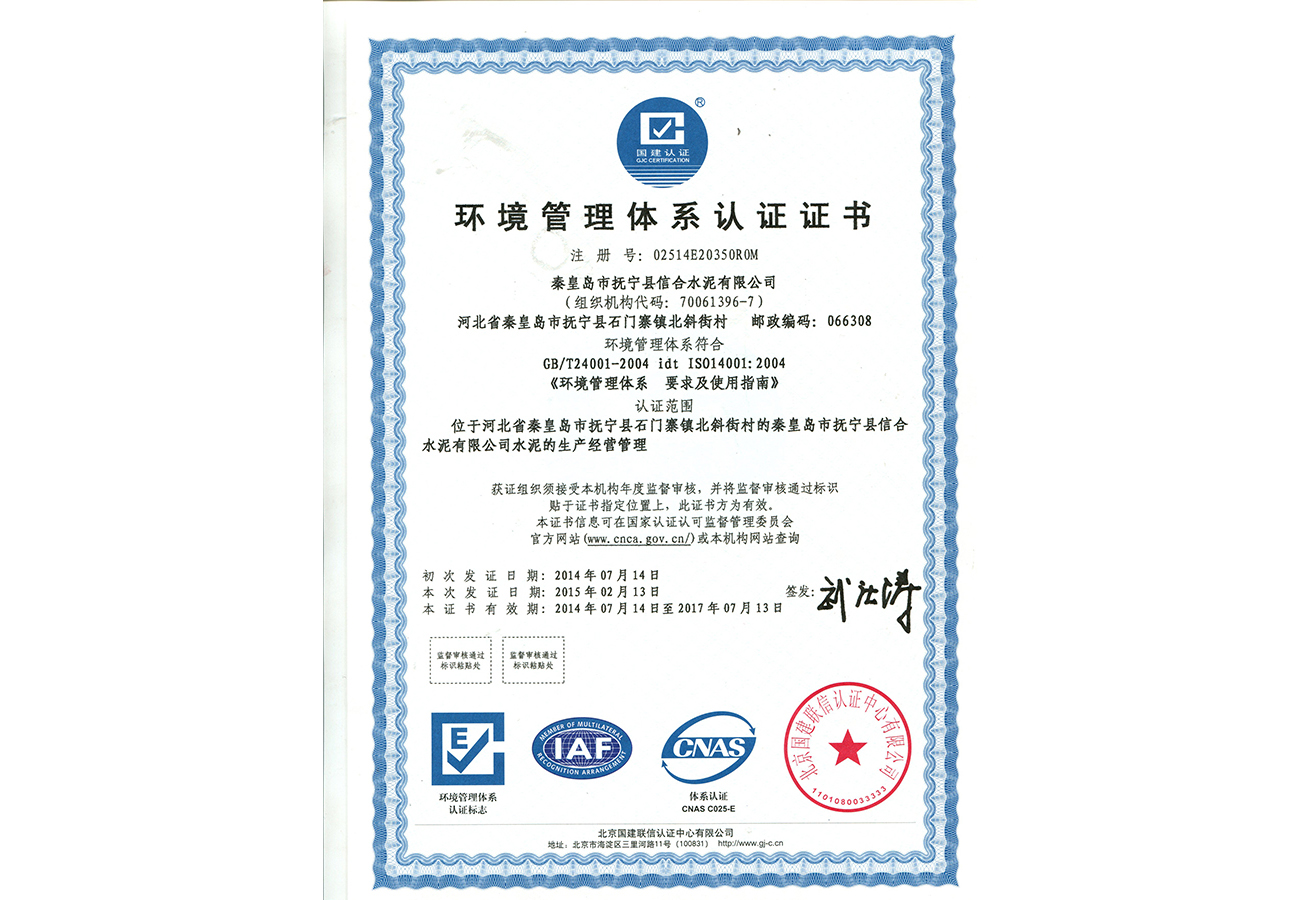 環(huán)境管理體系認證證書